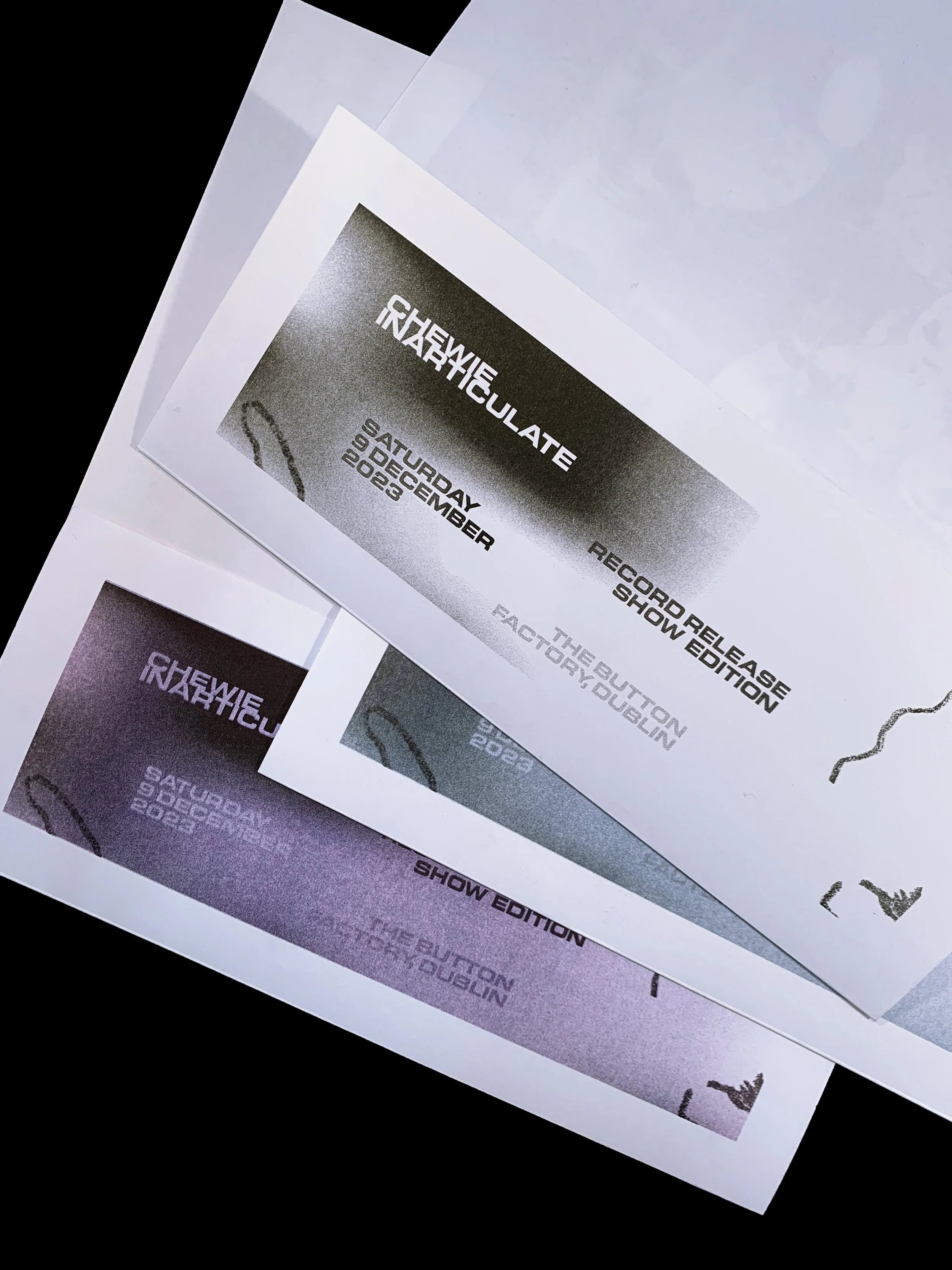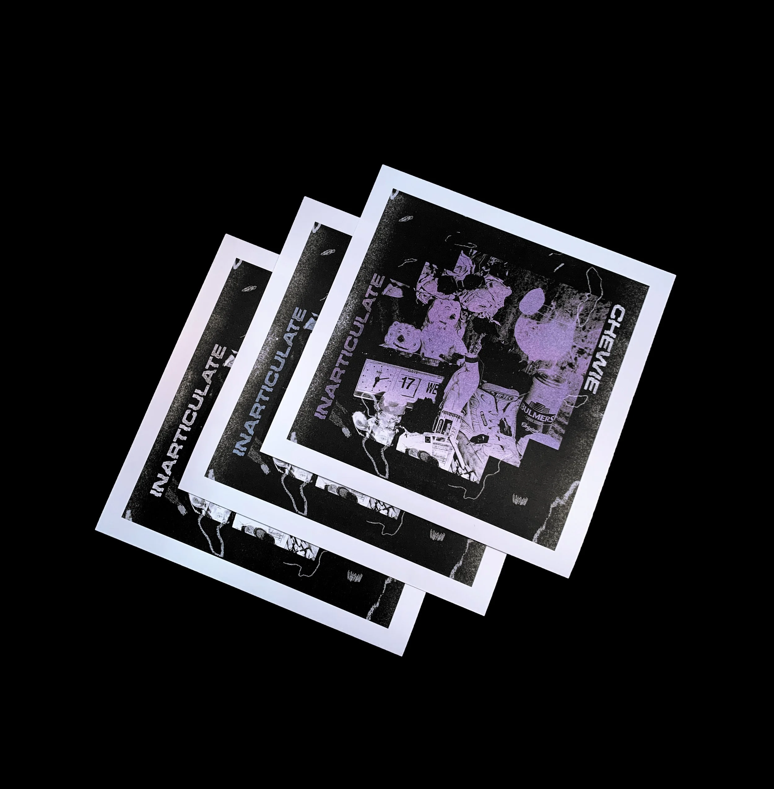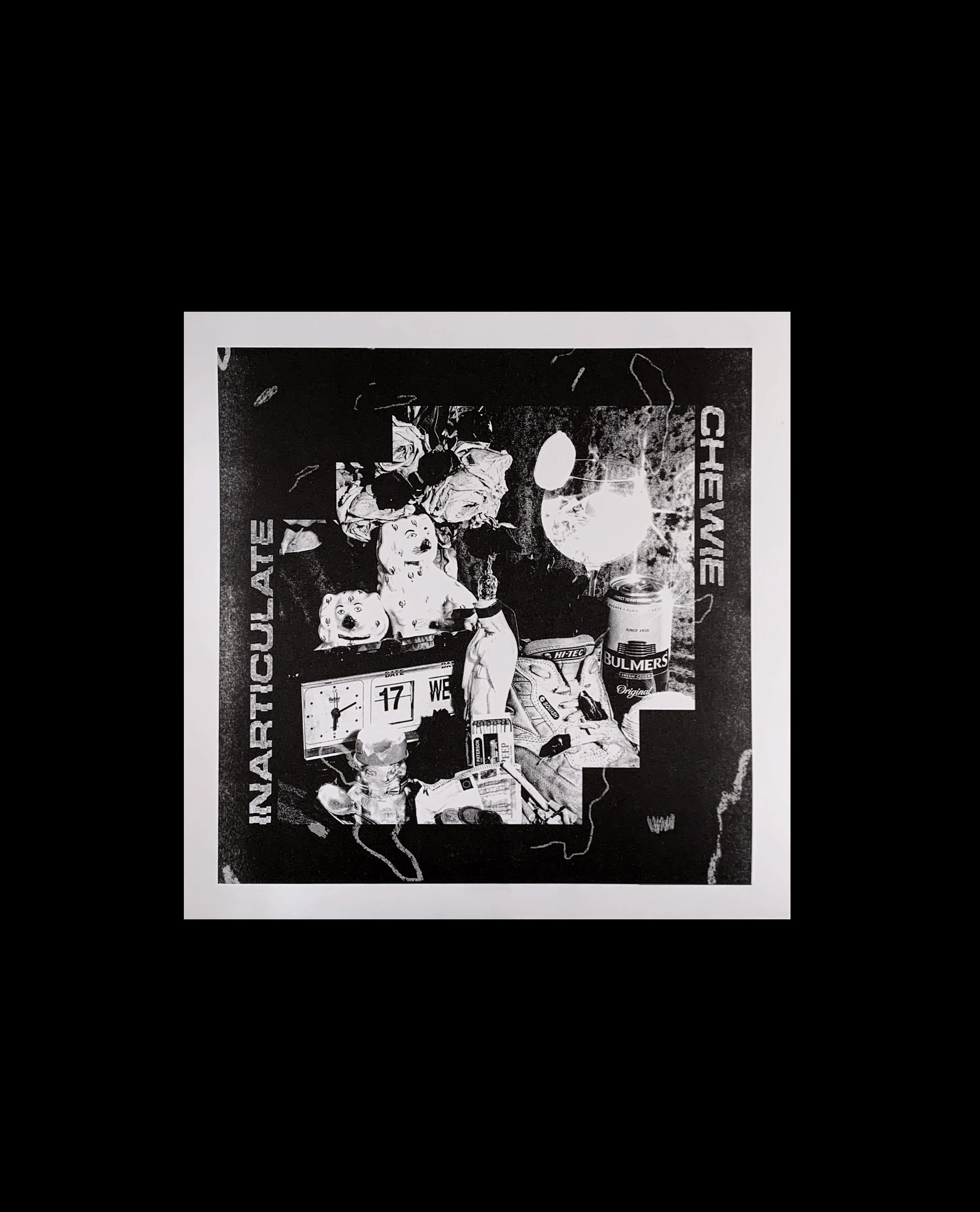 Designed & risograph printed limited edition record sleeve for the release ‘Inarticulate’ by Irish pop-punk band Chewie. Wrapped around the record for the first 50 records with 3 colour ways. Original album photo by Billy Woods.