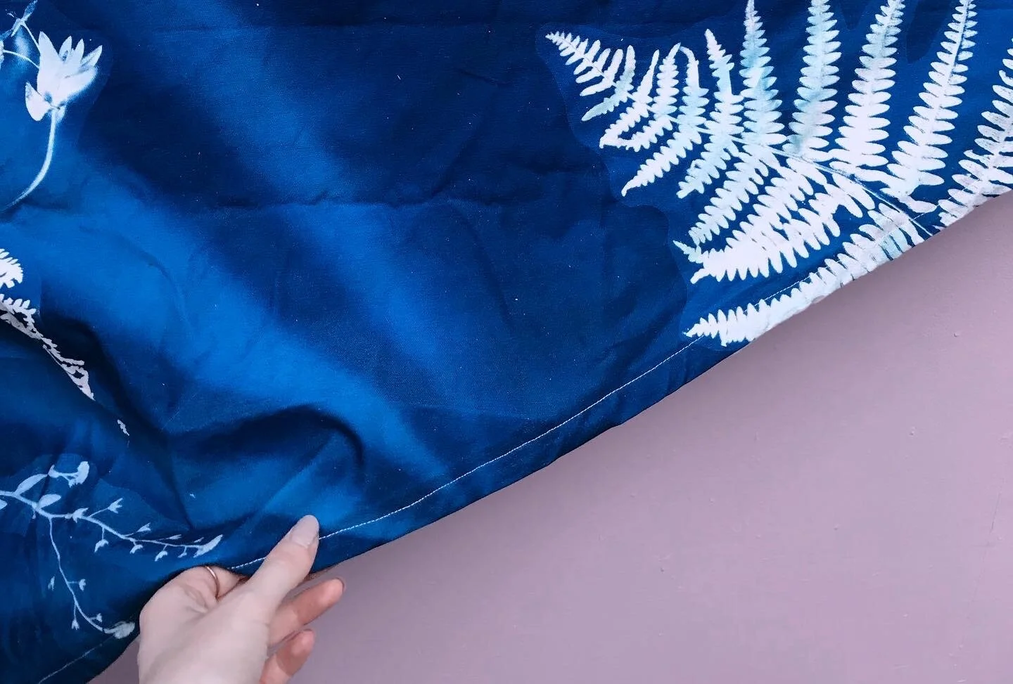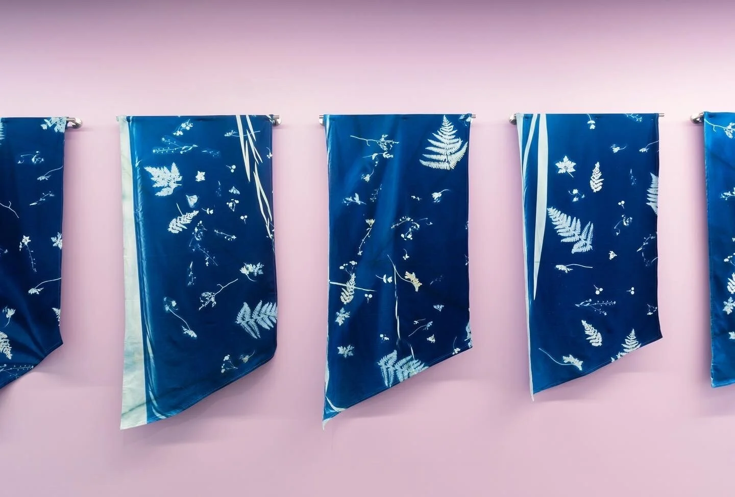 Holding explores nature and a feeling of stillness, capturing the beauty of wild flowers through this print process to elicit an emotional connection and allow the viewer time and space to reflect. The name refers to this moment of stillness and holding nature in reverence. Each piece of fabric lifts the wildflowers from the ground and into view. The deep blues created in the fabric prints result from an old photographic printing process called Cyanotype. The process uses two chemicals that mix together become photo-sensitive and produce a cyan-blue print when exposed to UV light. The fabric is first soaked in the chemicals, let them dry and then the designs are exposed for a tested duration to achieve these rich blue tints.